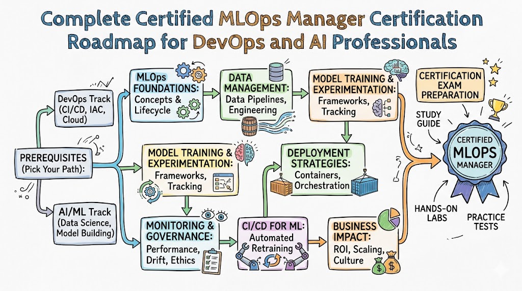 The Certified MLOps Manager is built for professionals who want to bring order, reliability, and operational discipline to machine learning systems. In many teams, machine learning work starts with strong excitement but later struggles because production operations are not handled properly. Models may be created, but deployment pipelines are weak. Monitoring may be limited. Governance may be missing. Teams may not know how to update models safely or manage collaboration between developers, data engineers, operations teams, and business stakeholders. MLOps addresses these issues, and this certification gives professionals a structured way to learn that responsibility.This guide is useful for a wide range of readers, including software engineers, DevOps practitioners, SREs, cloud engineers, data professionals, platform engineers, and technical managers. It is also helpful for professionals who want to shift their careers toward AI operations but need clarity before making that move. Instead of offering general statements, this guide looks at the certification from the point of view of real work, career progression, and enterprise value. That makes it useful for both beginners and experienced professionals.