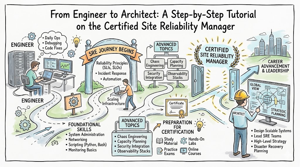 Navigating the transition from a hands-on engineer to a leadership role requires a specific blend of technical foresight and operational discipline. This guide focuses on the Certified Site Reliability Manager program, a specialized track designed for those who want to bridge the gap between high-level business objectives and day-to-day infrastructure stability. For any Site Reliability Engineer looking to scale their impact, understanding how to manage reliability at a team or organizational level is the next logical step in career progression. This roadmap is built to help professionals evaluate the program’s depth and determine how it fits into the broader ecosystem of platform engineering and cloud operations.